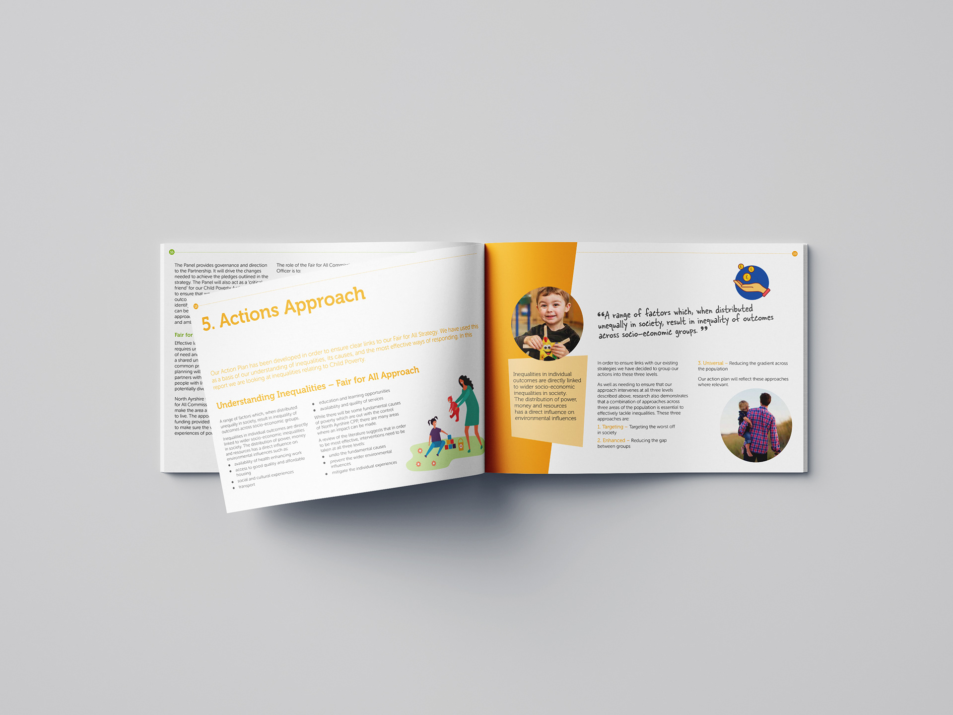 An Annual Report created for the North Ayrshire Community Planning Partnership. The main focus for the cover design was community. This was acheived with the use of bright illustrations and graphics which was carried through the layout.